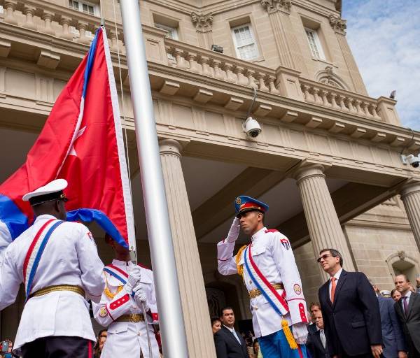 Tres militares marcharon por la puerta de la embajada e izaron el estandarte cubano -rojo, blanco y azul con una estrella solitaria-, bajo los acordes del himno cubano.