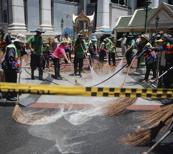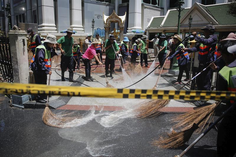 Los equipos de limpieza se afanaban a primera hora del día en borrar las manchas de sangre que impregnaban el pavimento de la intersección de Ratchaprasong, una de las más concurridas de la ciudad, donde se registró la deflagración al final de la tarde, en plena hora punta.