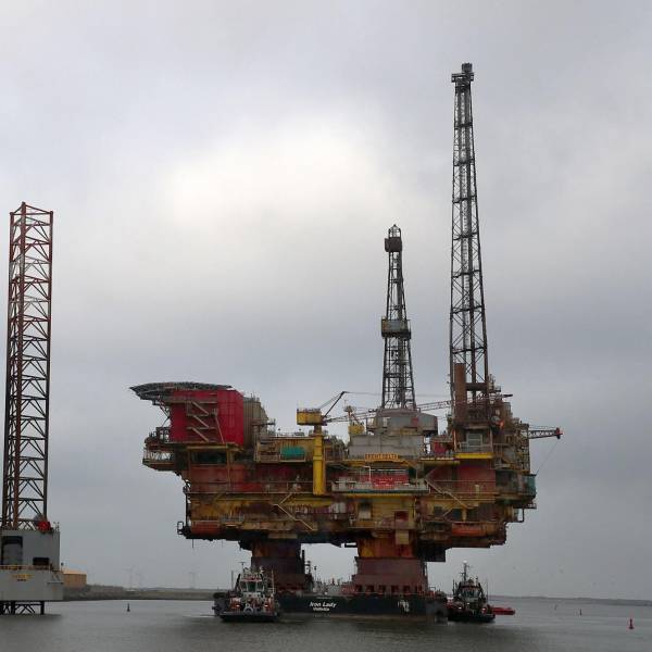 La plataforma de perforación petrolera offshore Brent Delta Topside de Shell es remolcada por remolcadores por el río Tees hasta el puerto de Able Seaton para su desmantelamiento en Inglaterra el 2 de mayo de 2017.( )