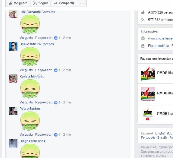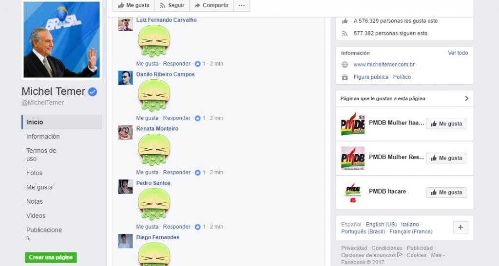 Miles de internautas "vomitaron" sobre el perfil en Facebook del presidente de Brasil, Michel Temer, luego de que el diario O Globo publicara la noche de este miércoles 17 de mayo de 2017 que el mandatario fue grabado dando su aval a un esquema de pago de sobornos.