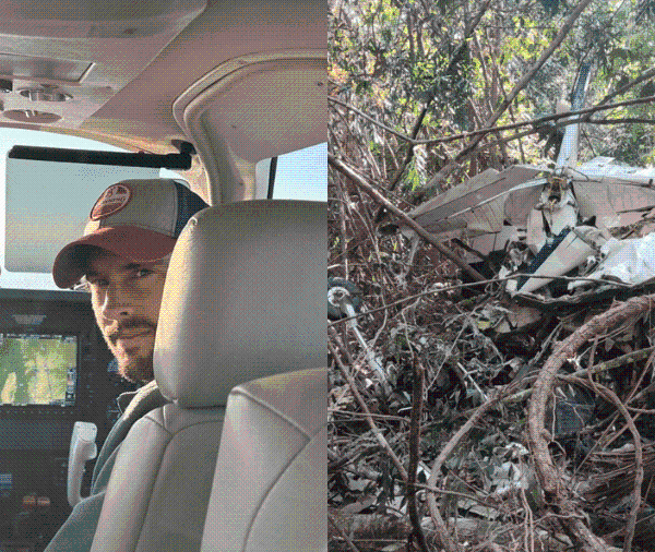 Garon Maia Filho y su hijo de 12 años del lado izquierdo de la imagen, mientras que a la derecha se ven los restos del avión accidentado. Foto: Captura de video.