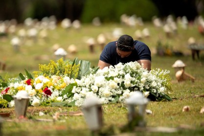 Un hombre visita una tumba en el cementerio Campo de Esperanza, en Brasilia. Foto: EFE.