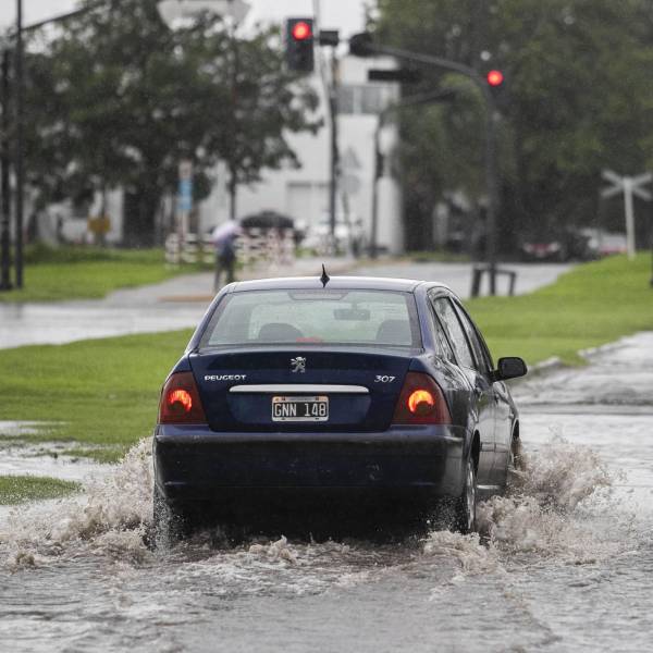 Un vehículo transita por una calle en medio de un aguacero este 20 de marzo de 2024, en La Plata, provincia de Buenos Aires (Argentina).( )