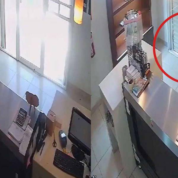 "Dónde, dónde", exige el criminal mientras busca desesperadamente debajo del ordenador, donde en teoría estaría la caja registradora con todas las ganancias. Desde allí, la mujer sale rápidamente por la puerta de vidrio, da un salto y baja la verja de metal en un rápido movimiento, mismo que el hombre no se percató con anterioridad.