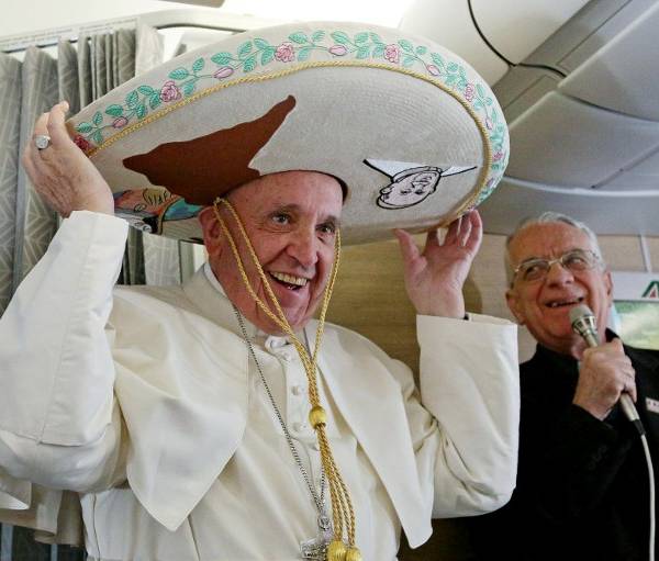 El papa Francisco citó a Cantinflas -después de que una periodista le regaló algunas de películas del cómico hace unos días- y no dudó en ponerse el sombrero tradicional durante el vuelo a México.