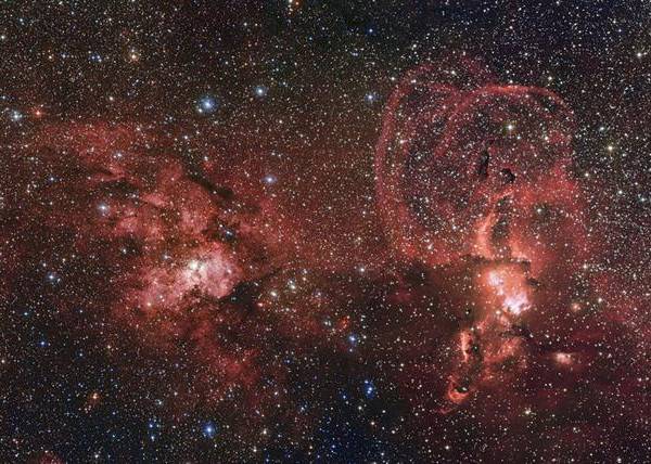 Mientras, el cúmulo NGC 3576, que está a unos 9.000 años luz, destaca por poseer dos grandes objetos curvos, "similares a los ensortijados cuernos de un carnero", señala el observatorio.