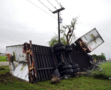 Cerca de la ciudad, un aparcamiento se vio afectado ayer por el paso de un tornado cuando 254 camiones y 204 tráileres permanecían estacionados en ese momento.