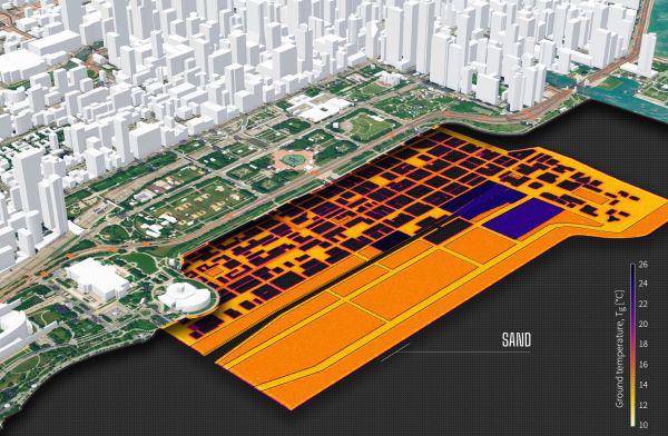 Gráfico del modelo 3D de la ciudad de Chicago muestra cómo es afectada por el cambio climático subterráneo de 1951 a 2051.( )