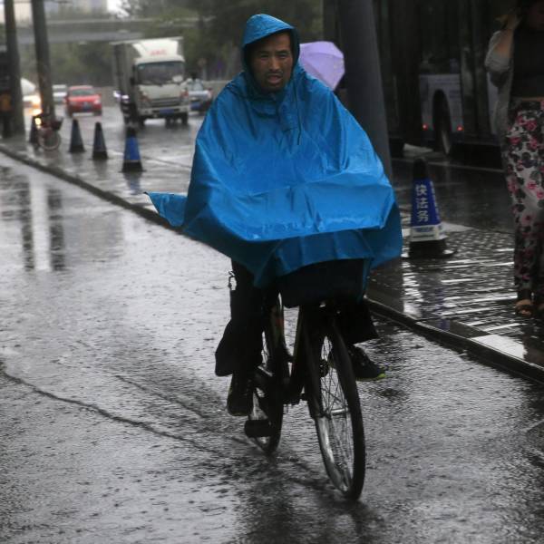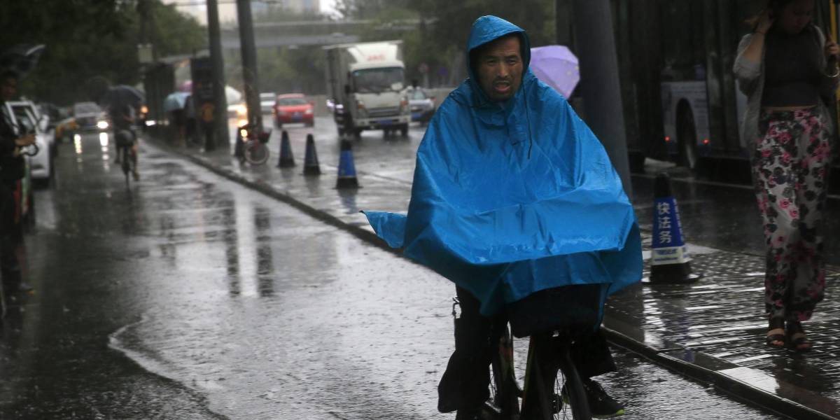Un ciclista circula bajo un chaparrón en Pekín, China( )