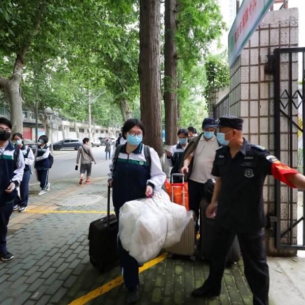 Guardia de seguridad dirige ingreso de alumnos en un centro de estudios en Wuhan, China. Foto: AFP