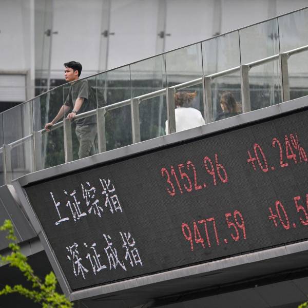 Personas cruzan un puente peatonal frente a una pantalla que muestra el índice compuesto de Shanghái y el índice componente de Shenzhen en el distrito financiero de Shanghái el 9 de abril de 2025.( )
