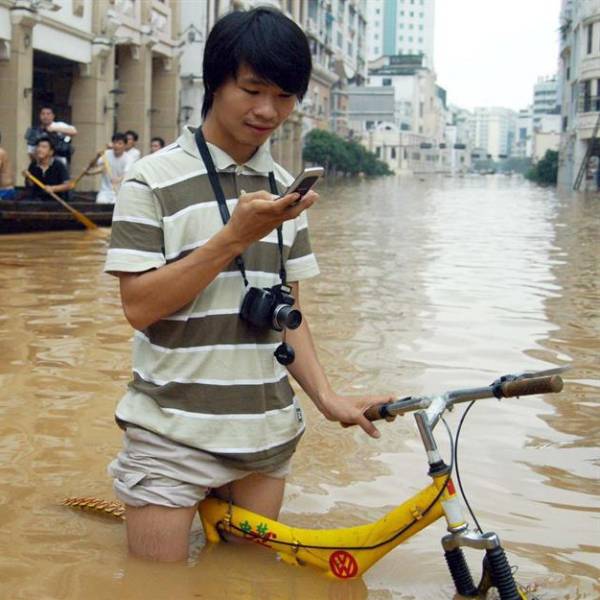 Fotografía de archivo en la que se registró a un joven observarndo su teléfono móvil, en medio de una calle inundada, en la ciudad de Wuzhou, China. ( )