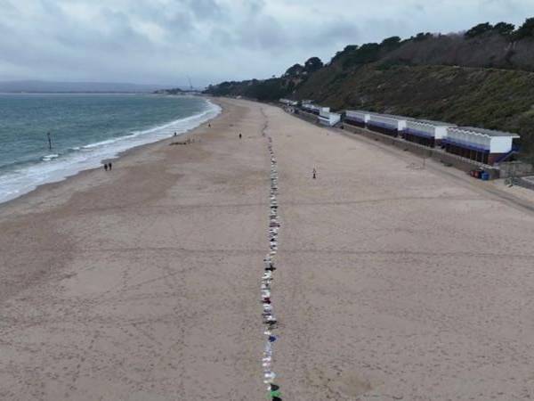 Una hilera de cinco kilómetros de ropa vieja de niños fue esparcida a lo largo de la playa de Bournemouth, Inglaterra, en una protesta por la guerra en Gaza.