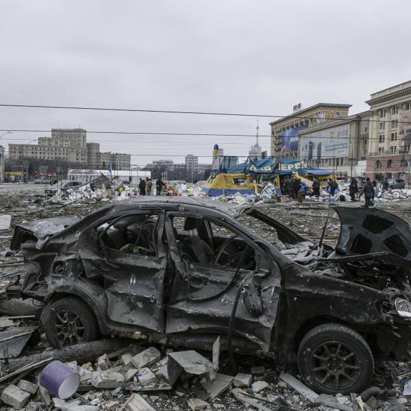 Vista de la plaza central de Járkiv, la segunda ciudad de Ucrania, tras bombardeos rusos, el 1 de marzo de 2022. (AP Foto/Pavel Dorogoy)