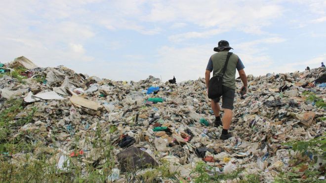 Image caption Muchos de los residuos plásticos que se encuentran en Jenjarom provienen de países extranjeros