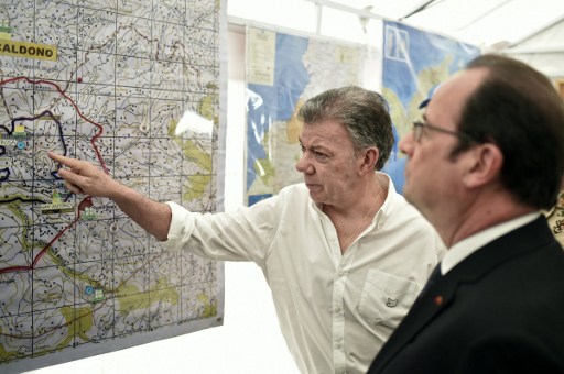 El Presidente Juan Manuel Santos recibió el mandatario francés y le mostró las zonas desmilitarizadas. Foto: AFP