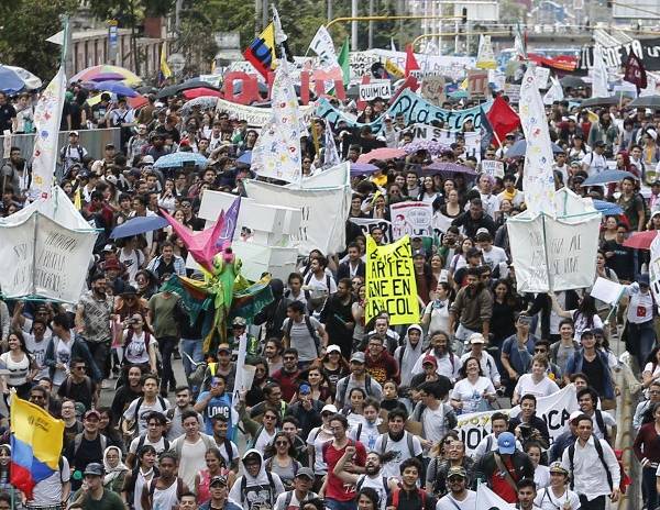 "Estamos marchando para exigir presupuesto para la educación pública", dijo a la AFP Elvis Hernández, un estudiante de filosofía de 22 años que junto a miles de universitarios llenó la Plaza de Bolívar, en el centro político de Bogotá.