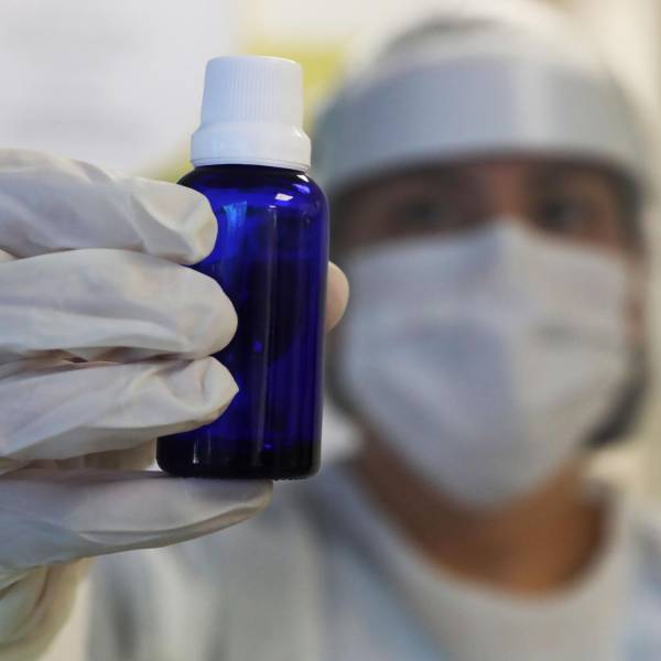 Fotografía de archivo del detalle de un recipiente de cannabis medicinal sostenido por un enfermero, en la clínica Zerenia, en Bogotá (Colombia). ( )