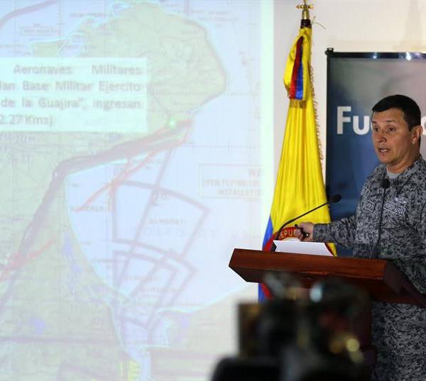 El mayor general Carlos Bueno, comandante de la Fuerza Aérea Colombiana (FAC), dijo en rueda de prensa que el domingo "a las 22H09 (03H09 GMT del lunes), una de las aeronaves militares venezolanas ingresó al espacio aéreo colombiano en el departamento del Vichada, en la zona conocida como La Venturosa, y Nueva Antioquia".
