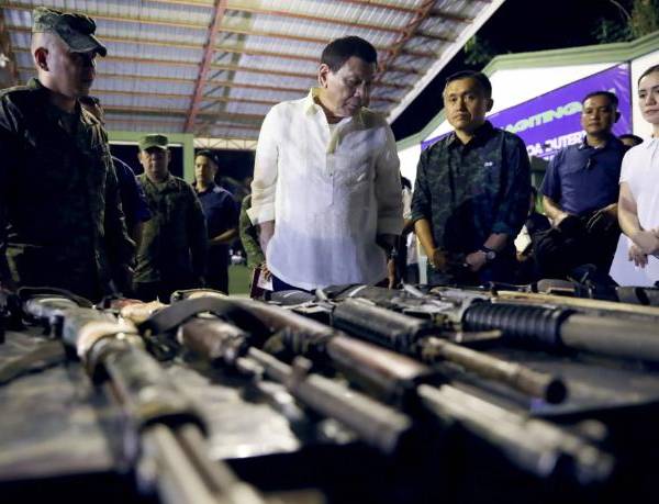 Rodrigo Duterte revisa una serie de armas incautadas por la policía.( )