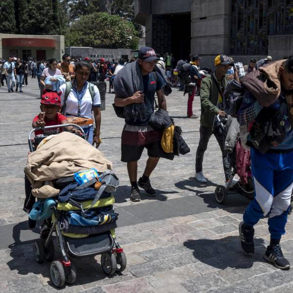 igrantes venezolanos y centroamericanos llegan al santuario de la Basílica de Guadalupe en la Ciudad de México el 31 de mayo de 2024, mientras viajan en una caravana que busca alcanzar la frontera entre México y Estados Unidos en busca de asilo.( )