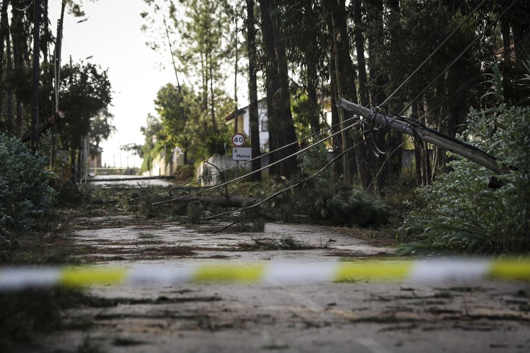 Poste eléctrico caído durante la tormenta post-tropical Leslie en Figueira da Foz. Foto: AFP