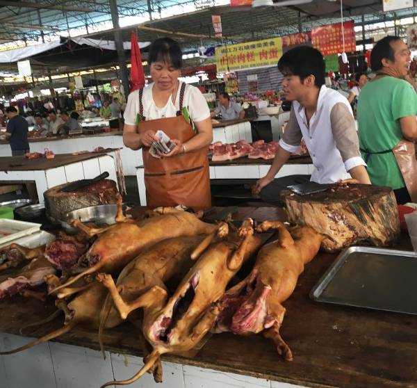 Pero el miércoles, los carniceros cortaban pedazos de carne canina y la salteaban en woks, una sartén abombada que se usa en China.