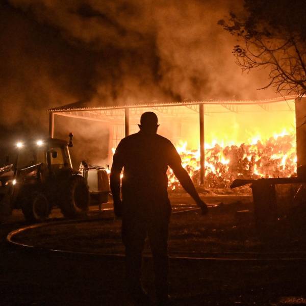 Bomberos y voluntarios combaten un almacén en llamas durante un incendio forestal en la aldea de Feneos, municipio de Corinto, Grecia.( )