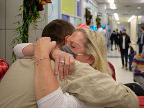 Una madre abraza a su hijo la llegada de este a Nueva York desde Reino Unido.( )