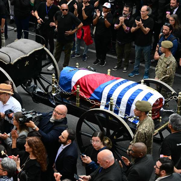 A pocos metros de la salida, en la puerta del Palacio Estévez y acompañado por la viuda de Mujica, Lucía Topolansky, el actual mandatario, Yamandú Orsi, colocó el pabellón patrio sobre el féretro, que es trasladado en una cureña.