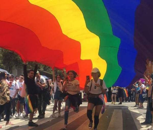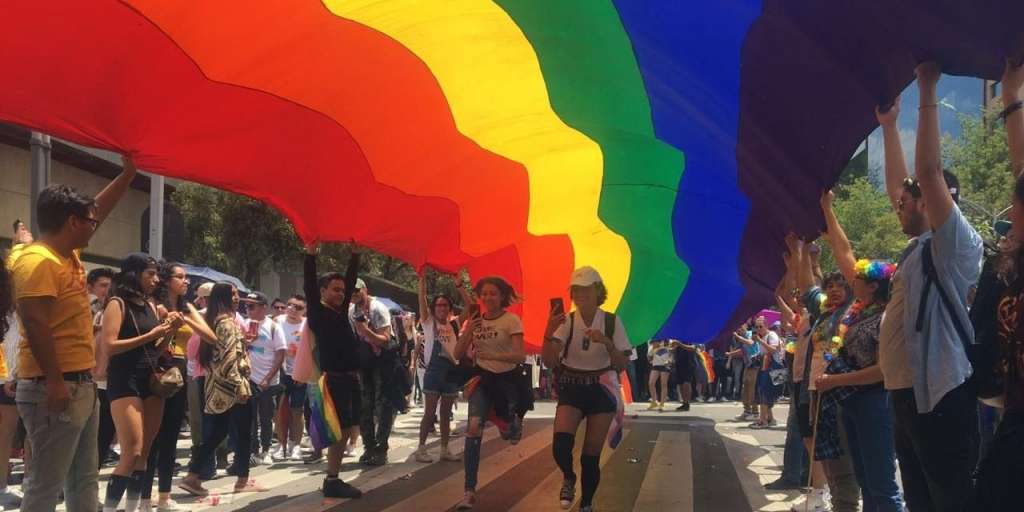 Ciudadanos 'ticos', celebrando debajo de una bandera de orgullo gay.