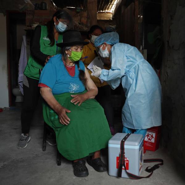 Fotografía de archivo en la que se registró a una mujer adulta mayor al ser vacunada contra la covid-19 en Lima, Perú( )