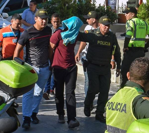 Los agentes de policía escoltan a un sospechoso de ataque con bomba en Barranquilla