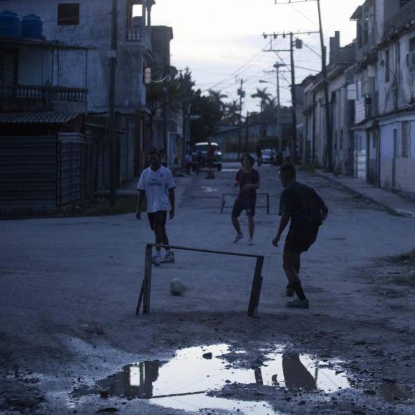 Varios jóvenes que juegan fútbol durante un apagón, en el municipio Cerro, en La Habana (Cuba).( )