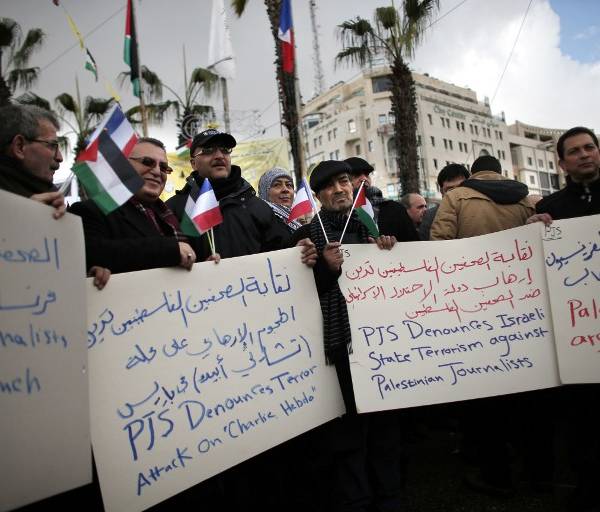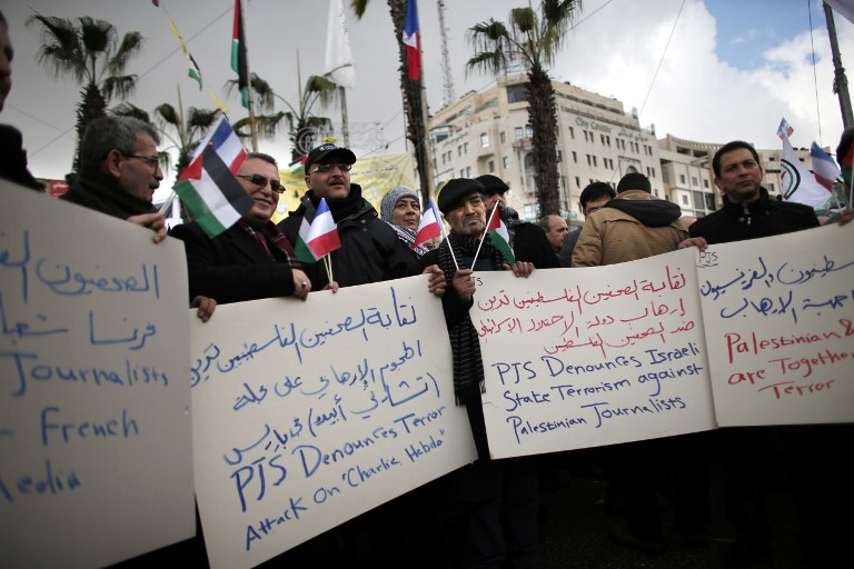 En Ramala, los manifestantes retomaron la pancarta "Yo soy Charlie", escrita en árabe, y en Gaza estaba programada una vigilia con velas delante del Centro Cultural Francés, golpeado hace poco por un ataque con bombas que fue reivindicado por yihadistas.
