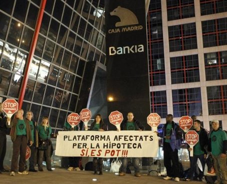 Españoles y migrantes, entre ellos ecuatorianos, acampaban frente a Bankia en protesta por los desahucios de esta entidad bancaria y para pedir que les reciban sus departamentos por la totalidad de los valores pendientes, para en adelante quedar libres de deudas.