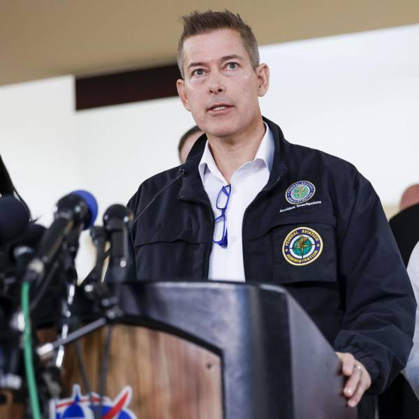 El Secretario de Transporte de EE. UU., Sean Duffy (C), ofrece actualizaciones sobre la colisión de un avión de pasajeros y un helicóptero militar( )