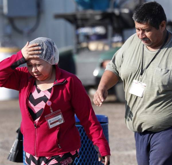 Las primeras imágenes de las redadas muestran a los inmigrantes caminando en fila hacia los autobuses con las manos esposadas, algunos con la cabeza baja, llevando todavía puesta la cofia de trabajo.