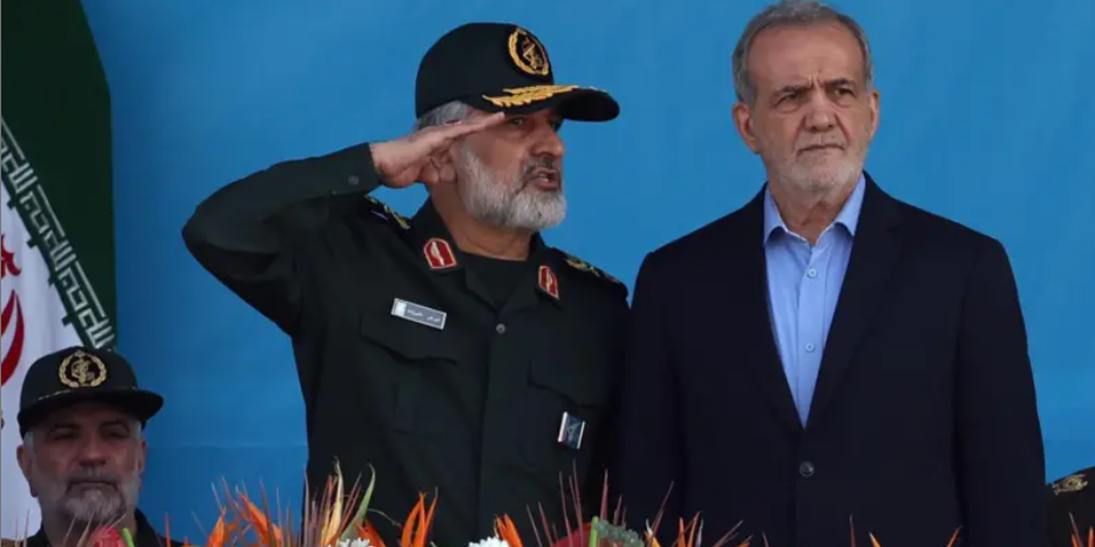 El presidente iraní Masoud Pezeshkian (d) y el comandante de la Fuerza Aeroespacial del Cuerpo de la Guardia de la Revolución Islámica, Amir Ali Hajizadeh (i), asisten a un desfile militar en Teherán, Irán (21 de septiembre de 2024).( )