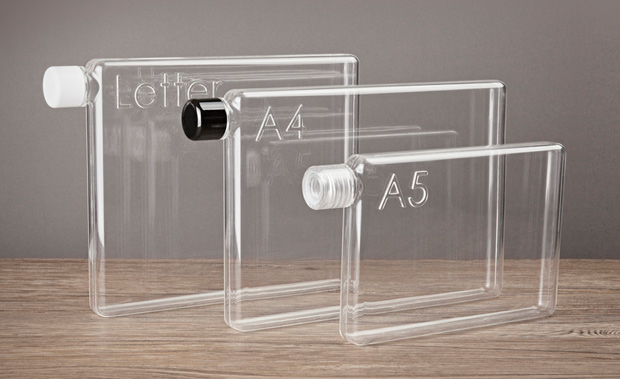 Llamada Memobottle, la "botella" viene en tres tamaños denominados como las proporciones de los papeles: Letter, A4 (ambos de 1.25 litros de capacidad) y A5 (750 ml).