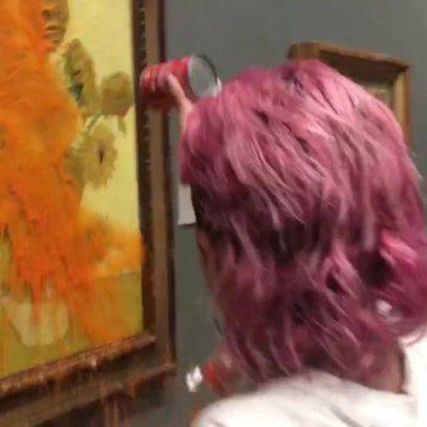 El famoso cuadro "Los Girasoles" de Van Gogh terminó manchado con sopa de lata.