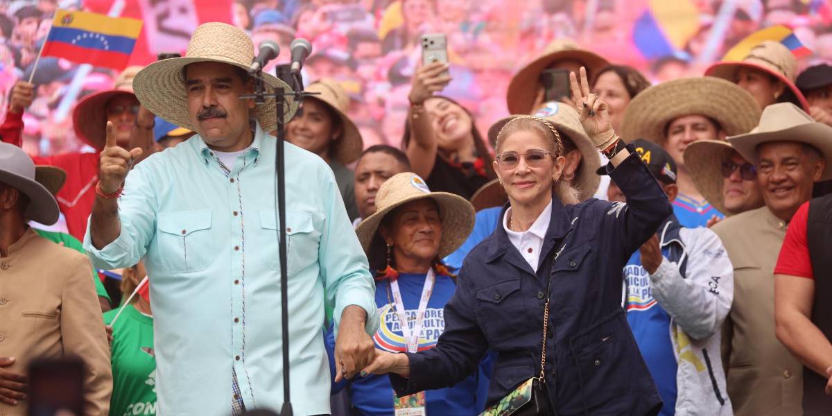 El presidente de Venezuela, Nicolás Maduro (i), pronuncia un discurso junto a su esposa, Cilia Flores, durante una marcha el miércoles, en Caracas (Venezuela). ( )