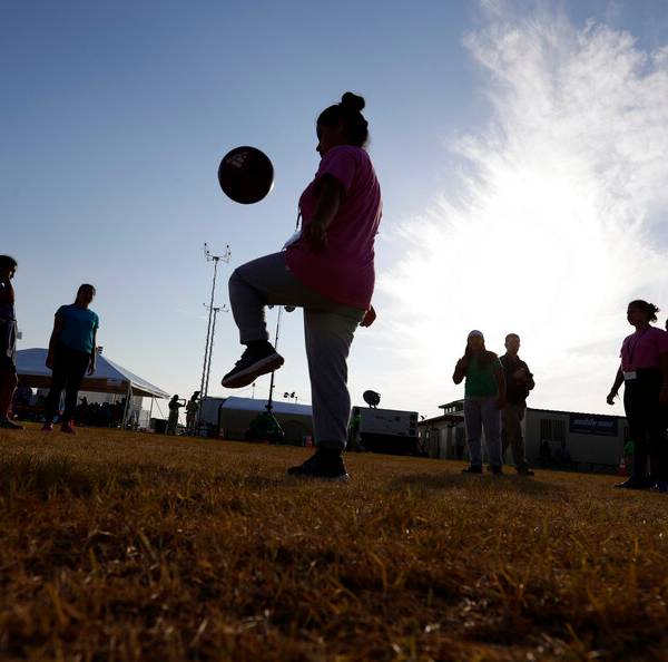 Inmigrantes juegan fútbol en un centro de detención para niños migrantes. Foto: AP.