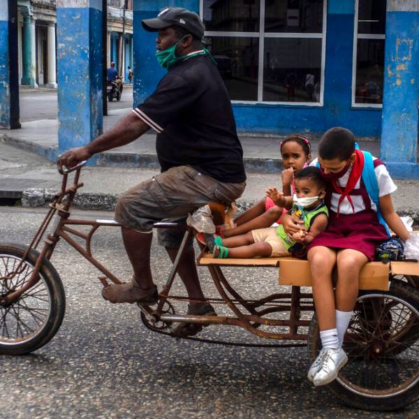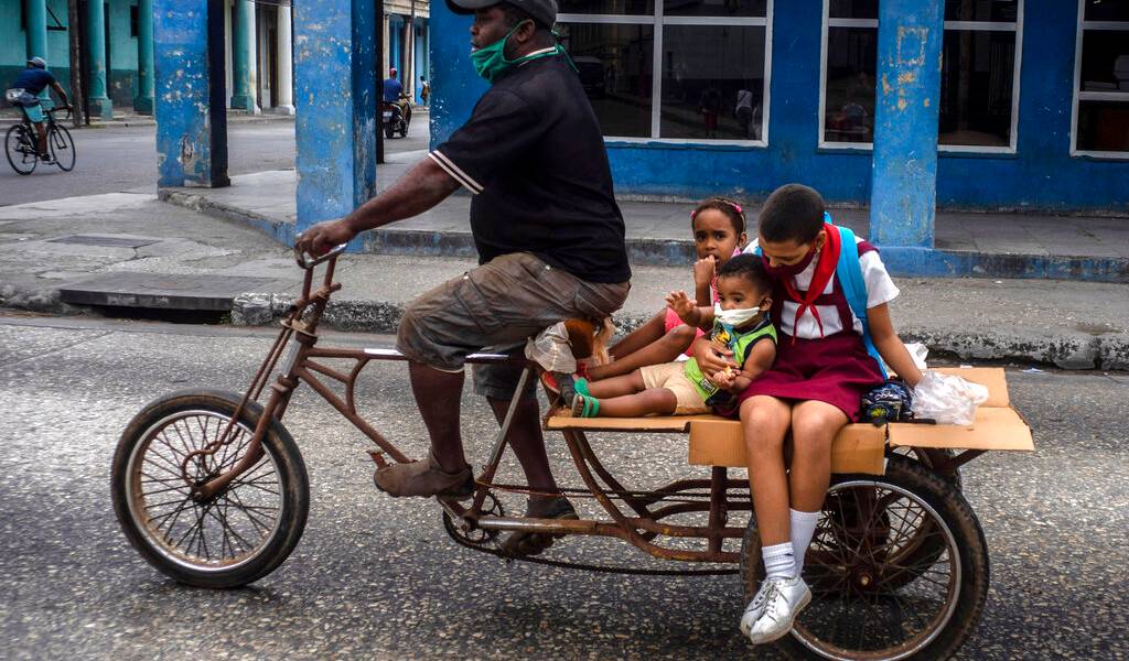 Un hombre transporta a niños en su triciclo el 8 de enero de 2021