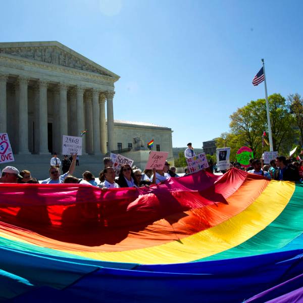 Manifestantes se congregan delante de una bandera de arcoiris frente a la Corte Suprema de Estados Unidos en Washingto. Foto: AP