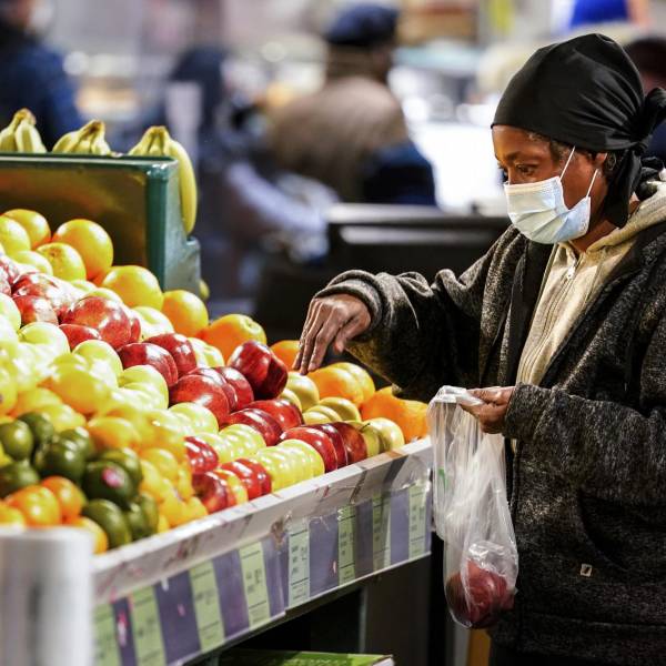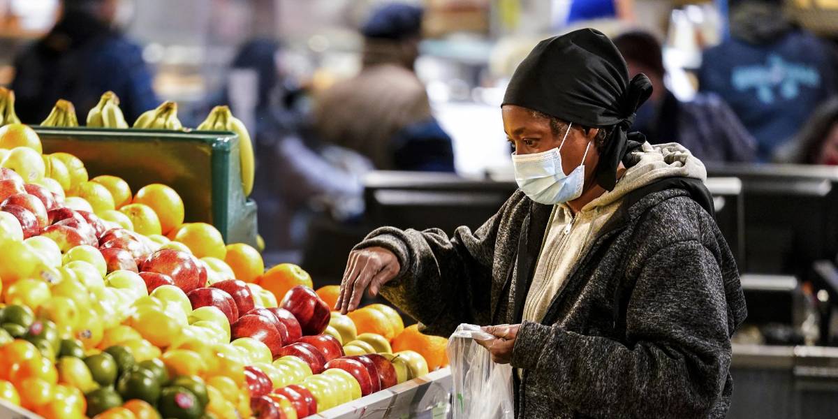 Una mujer con una mascarilla para el coronavirus selecciona frutas en el mercado de Reading Terminal en Filadelfia.( )