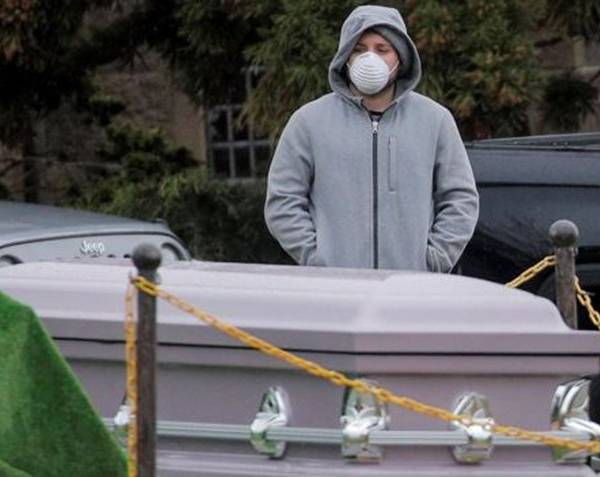 Ciudadano de New York, observa el ataúd de un familiar fallecido.