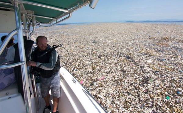 Cubiertos plástico y otros materiales conformaban el "mar de basura" cercano a la isla de Roatán. Foto cortesía de Caroline Power.