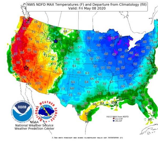 "Para aquellos en el este... no, no están alucinando... estas son las temperaturas más altas previstas para el sábado 9 de mayo. ¡Si, mayo! Una diferencia de cerca de 100°F en EE.UU.", indicó el organismo en Twitter.