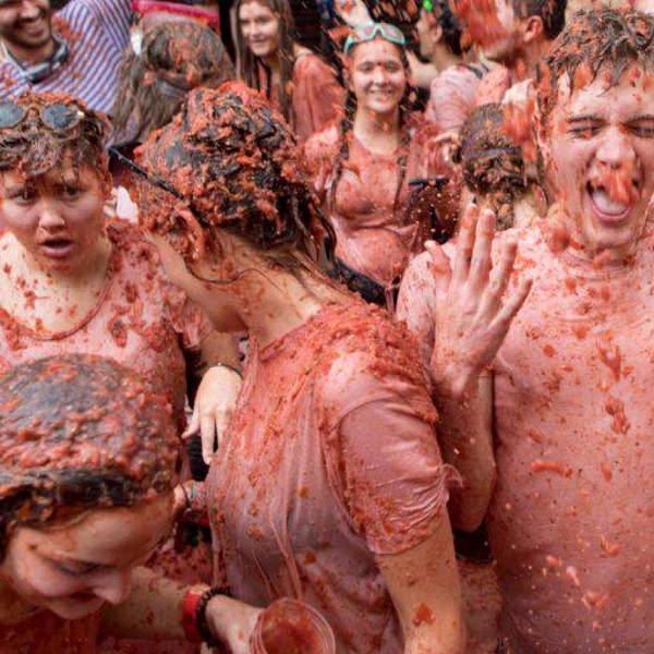 La localidad española de Buñol, en España, ha vuelto a colorear de rojo sus calles más céntricas con 120 000 kilos de tomates de la variedad pera en su mundialmente conocida fiesta de la Tomatina, que este año ha ofrecido su experiencia más VIP con entradas a 500 euros, es decir, USD 556 para vivirla desde dentro de los camiones que transportan la atípica munición.
